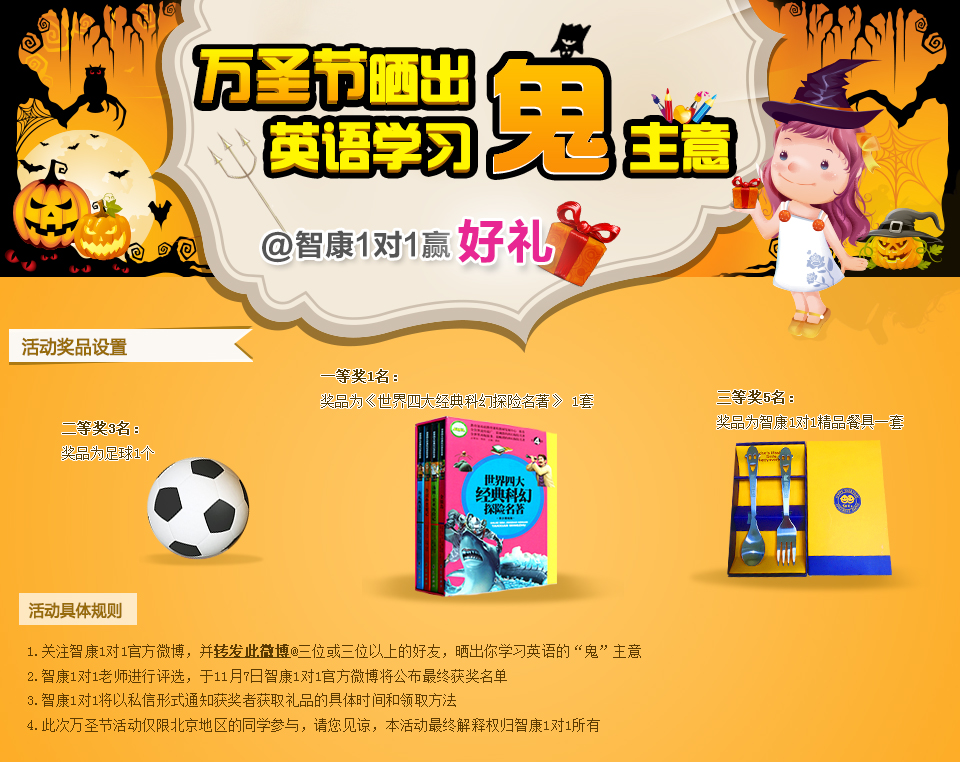10月26日-11月6日,關注并@智康1對1微博,轉發(fā)詳細中鏈接的微博活動@三位好友,曬出你學習英語的“鬼”主意,就有機會免費贏取《世界四大經(jīng)典科幻探險名著》全套!更多禮物等著你,快來參與吧!「詳細」